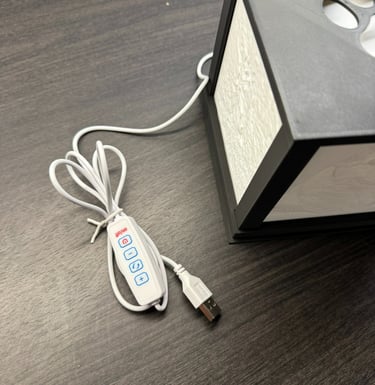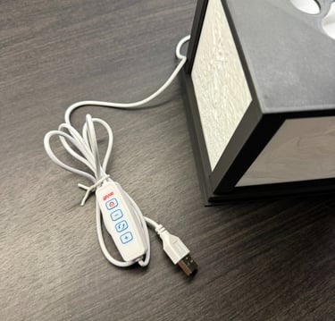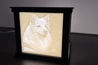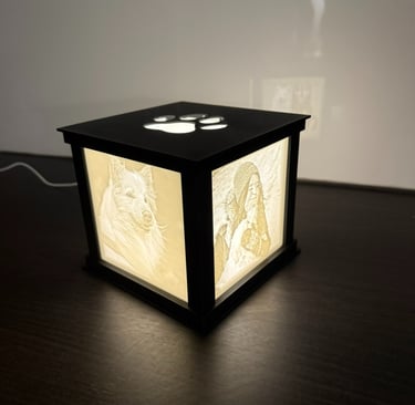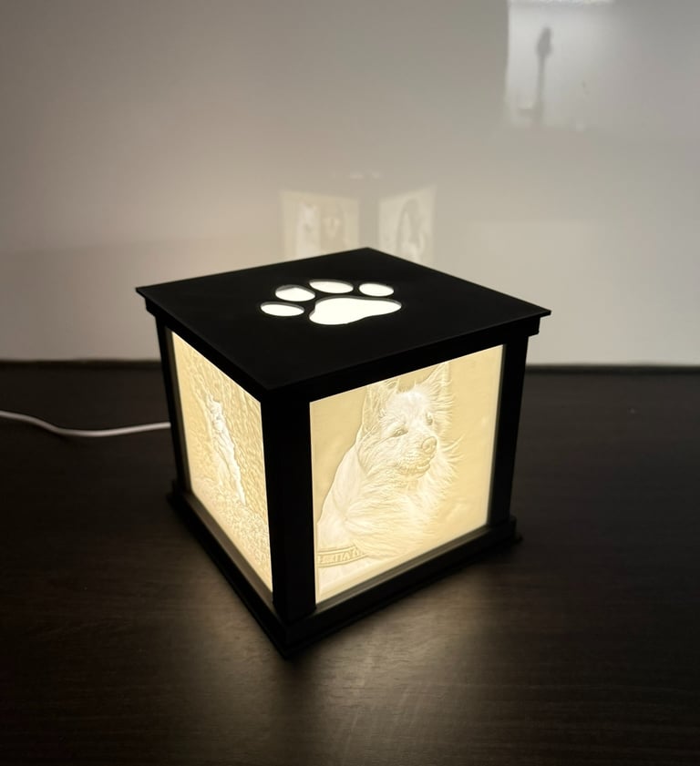 Kuution sisällä oleva hillitty, kiinteä LED-korostus tuo kuvien muodot ja yksityiskohdat kauniisti esiin. Valo ei ole tarkoitettu yleisvalaistukseen, vaan se toimii osana teosta – korostaen kuvia ja niiden kolmiulotteisuutta. Saatavilla kolme erilaista kansivaihtoehtoa - Tassu, sydän tai tyhjä kansi.