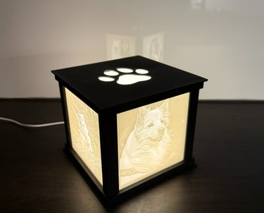 Valaistu valokuvakuutio on yksilöllinen taide- ja sisustusesine, joka valmistetaan asiakkaan omista valokuvista. Kuution neljälle sivulle sijoitetut 3D-tulostetut kuvat muodostavat yhtenäisen kokonaisuuden, jossa jokainen näkymä kertoo osan tarinaa.